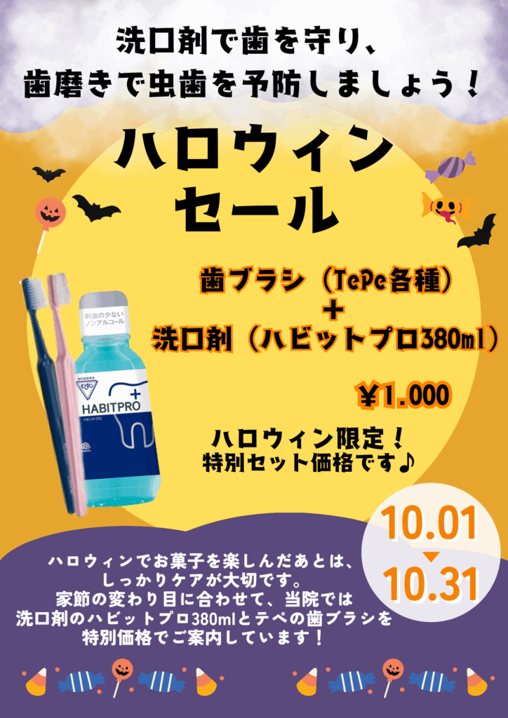そこで当院では、ハビットプロ380mlの洗口剤とテペの歯ブラシを特別価格でご案内するハロウィンセール